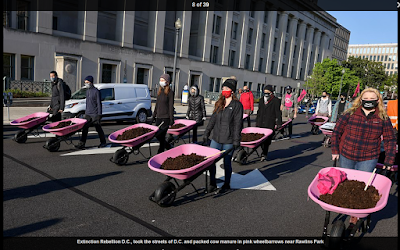 Nhiều video được đăng trên mạng xã hội cho thấy những người biểu tình, với nhóm Nổi dậy Chống Chính phủ D.C đánh dấu Ngày Trái đất bằng cách thay phiên nhau đổ những chiếc xe cút kít màu hồng đầy phân bò bên ngoài lối vào phía đông của Tòa Bạch Ốc, nơi ông Biden đang tiếp đón 40 nhà lãnh đạo thế giới trong hai ngày trên không gian ảo. Hăng hái nhất là tập thể trẻ thanh thiếu niên choai choai, hô vang khẩu hiệu: PHẢI TUYÊN BỐ KHẨN CẤP, và ĐỪNG BỐ LÁO! Phải hứa làm cho khí thải xuống số 0 vào năm 2025